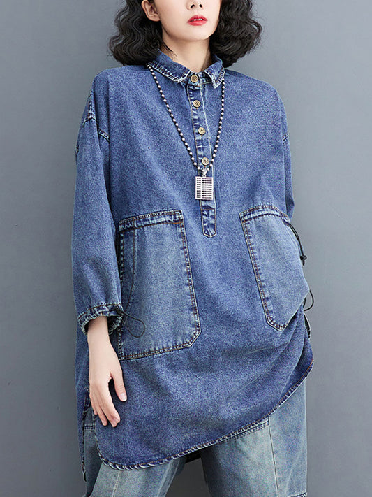 Women Casual Spring Solid Stitching Denim Long Shirt