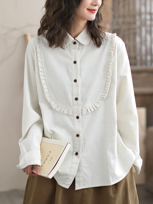 Women Spring Lacework Spliced Corduroy Solid Shirt