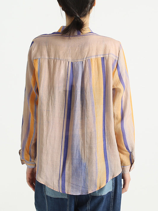 Stripe Women Ramie Long Sleeve Loose Shirt