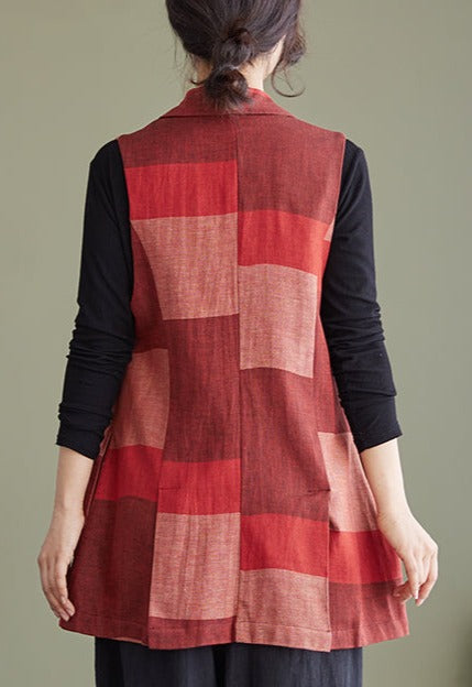 Spring Women Linen Plaid Retro Sleeveless Suit Collar Coat