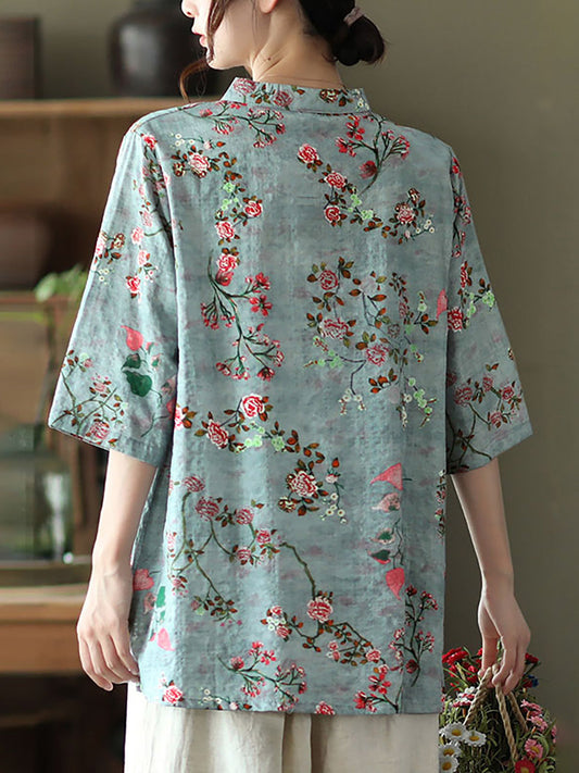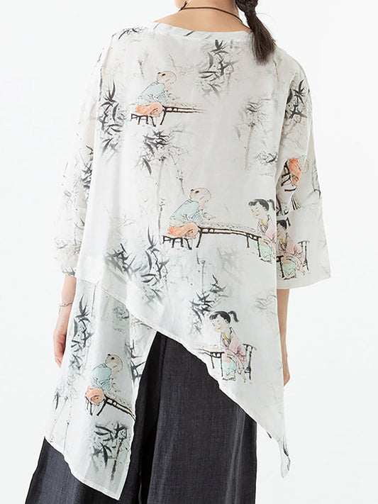 Plus size - Cotton Linen Floral Irregular Vintage Shirt