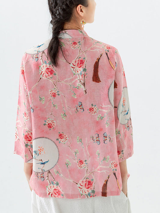 PLUS Size - Linen Floral Print Vintage Casual Irregular Shirt